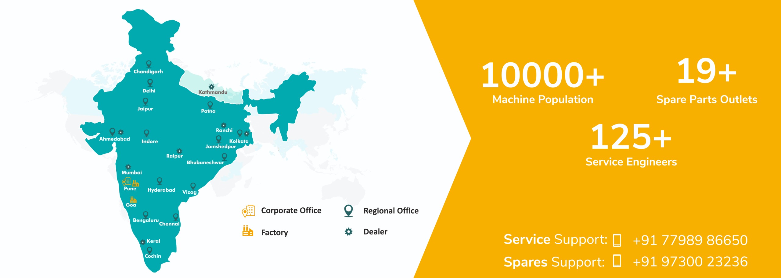 We are proud of our well-trained and experienced nationwide service team, with a total strength of more than 100 service engineers, across major cities. We have an ERP-backed India-wide spare parts warehouse network, special spares stock for the Indian subcontinent market and an established spares support framework for other international customers. All our national and internal installations are additionally supported by our 24×7 remote service support, which includes remote troubleshooting and assistance of our machines.